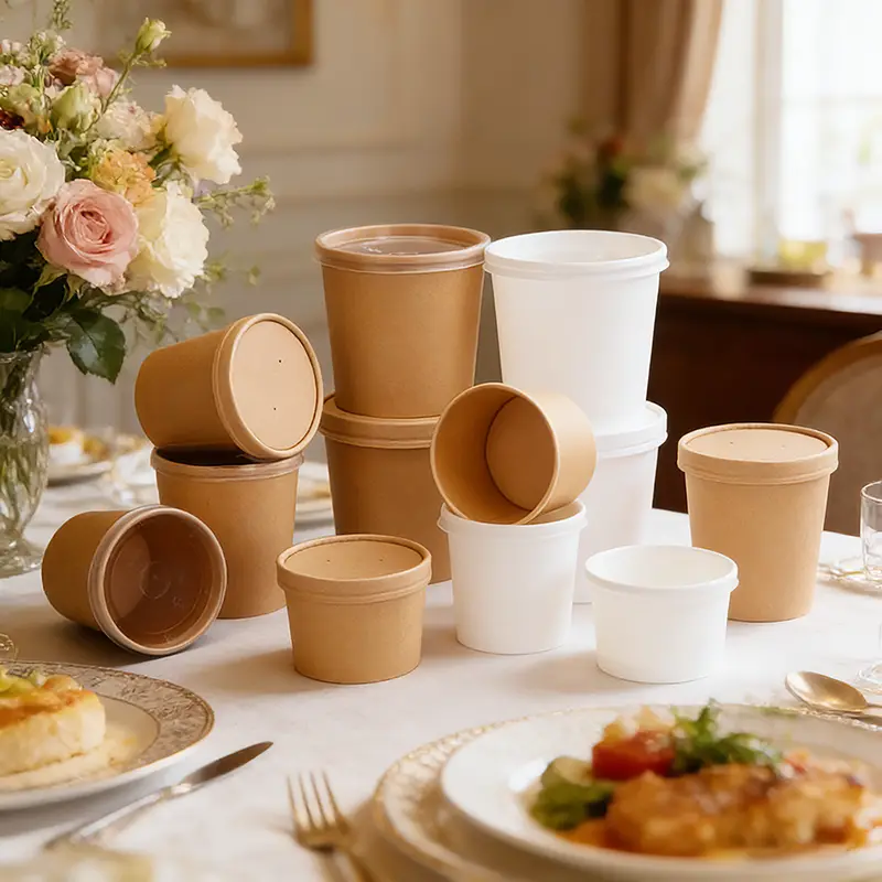 Ningbo Powerr จัดหาชามกระดาษซุปกระดาษคราฟท์คุณภาพ 32oz มีสารเคลือบภายในทำให้ชามกันน้ำและกันน้ำมัน ขอบชามเป็นแบบขอบโค้งมนจึงเรียบลื่น ไม่เพียงแต่ป้องกันความร้อนไม่ให้ทะลุ แต่ยังมีโอกาสน้อยที่จะทำให้เกิดการบาดเจ็บที่มือ ขอบด้านล่างได้รับการประมวลผลด้วยเทคนิคการปักลายนูนแบบเกลียว ด้วยวิธีนี้จึงสามารถเชื่อมต่อด้านล่างและผนังโถได้อย่างแน่นหนา ก้นชามจะมีโอกาสหลุดออกน้อยลง และของเหลวด้านในก็ไม่น่าจะรั่วไหลผ่านข้อต่อด้วย ในที่สุด โถทั้งหมดก็มีความต้านทานแรงดันได้ดีเยี่ยม แม้จะเต็มไปด้วยอาหารก็ไม่มีแนวโน้มที่จะยุบเมื่อวางซ้อนกัน ผู้ใช้สามารถใช้บรรจุและขนส่งอาหารปริมาณมากได้อย่างปลอดภัย