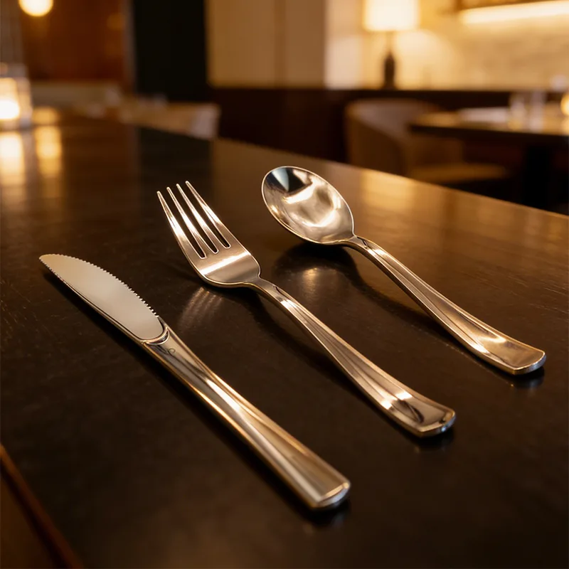 Classic Party Knives Forks Spoons Plastic Cutlery เป็นเครื่องใช้บนโต๊ะอาหารพลาสติกแบบใช้แล้วทิ้งระดับไฮเอนด์ที่เราสร้างสรรค์อย่างพิถีพิถัน ในฐานะผู้ผลิต ซัพพลายเออร์ และโรงงานระดับมืออาชีพในประเทศจีน เราให้ความสำคัญอย่างยิ่งต่อคุณภาพของผลิตภัณฑ์และประสบการณ์ผู้ใช้เสมอ ด้วยผลิตภัณฑ์นี้ เราได้กำหนดรูปแบบและรูปลักษณ์ของเครื่องใช้บนโต๊ะอาหารแบบใช้แล้วทิ้งใหม่ ชุดนี้ประกอบด้วยเครื่องใช้บนโต๊ะอาหารสามประเภท ได้แก่ มีด ส้อม และช้อน เหมาะสำหรับงานปาร์ตี้ งานเลี้ยง และโอกาสอื่นๆ สามารถใช้แทนภาชนะโลหะบนโต๊ะอาหารแบบดั้งเดิมได้อย่างสมบูรณ์แบบ โดยยังคงรักษารูปลักษณ์ที่สวยงามของภาชนะโลหะในขณะที่ยังมีความสะดวกในการใช้ผลิตภัณฑ์แบบใช้แล้วทิ้ง