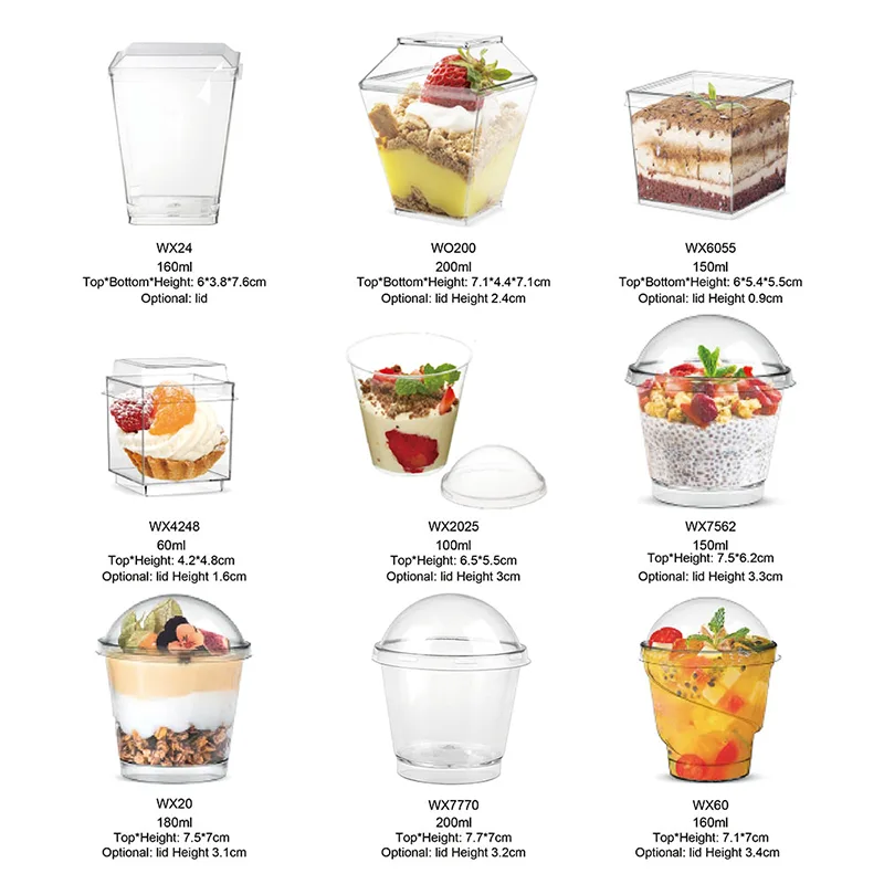 มีหลากหลายสไตล์และเข้ากันได้ดี เหมาะสำหรับของหวานและโอกาสต่างๆ สินค้าที่มีฝาปิดเหมาะสำหรับการพกพาและขนส่งอาหาร รูปแบบความจุขนาดเล็กสามารถใช้เป็นถ้วยชิมได้ รูปแบบความจุขนาดใหญ่สามารถตอบสนองความต้องการของการชุมนุม